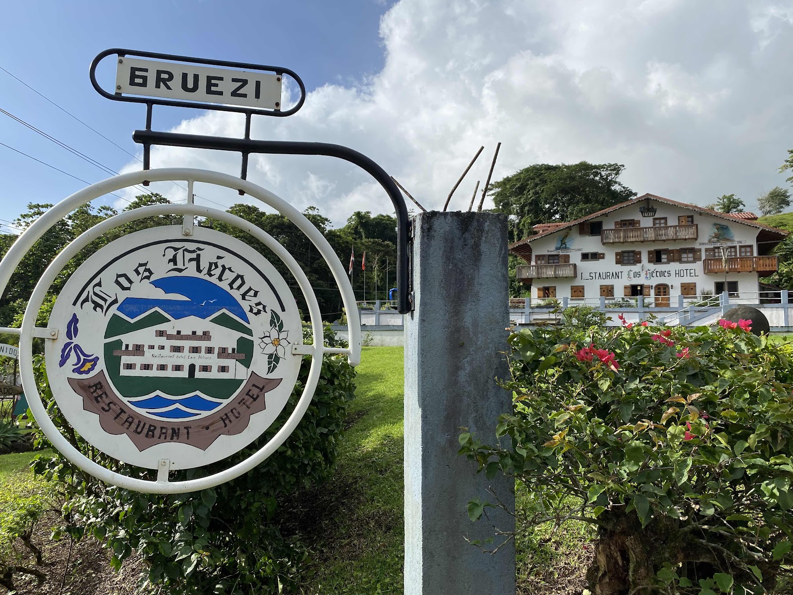 Von dort schlängelte sich dann eine bessere Strasse dem Seeufer entlang. Plötzlich sahen wir am Wegrand ein Schweizerkreuz und eine Schweizerfahne, sodass wir umdrehten und uns das etwas genauer anschauten. Das Hotel Los Heroes wurde ganz im Stile eines Schweizer Chalets gebaut.